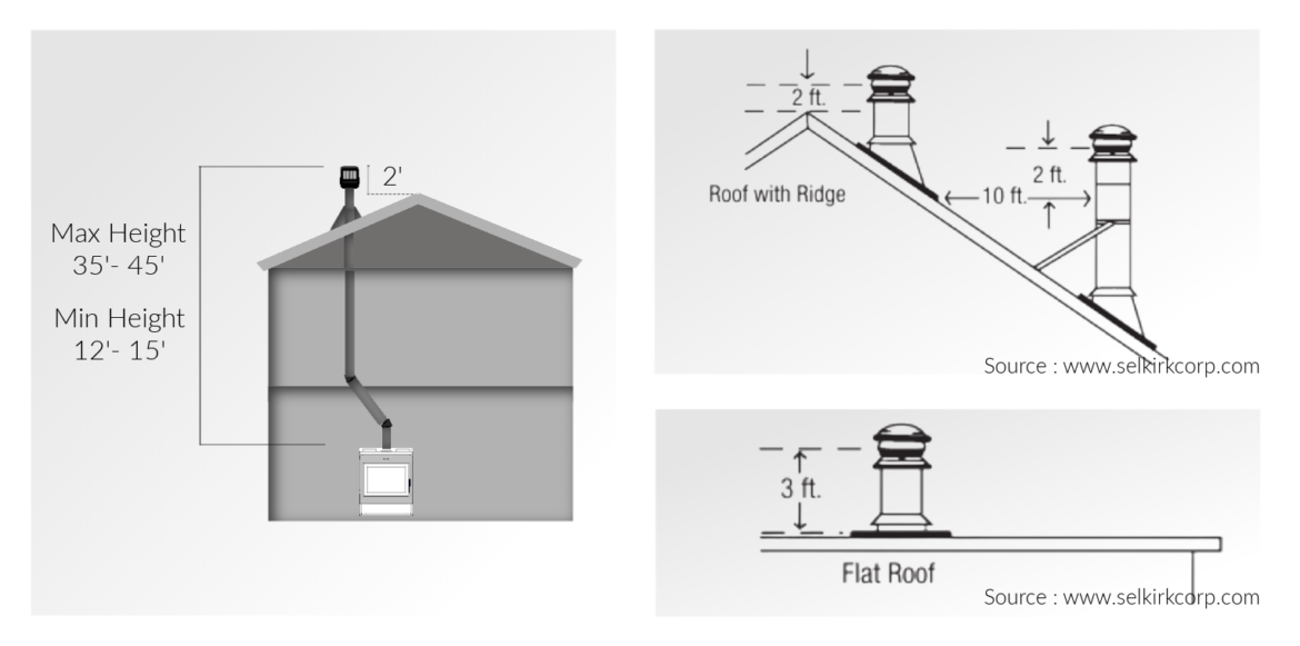Chimneys must extend up above the roof. They cannot be horizontally vented through a sidewall like a direct vent gas fireplace. Even on a flat roof, the code requires at least 3 feet of chimney above the roof. Since most roofs are pitched, the code also states a chimney must be two feet higher than anything measured within 10 feet of it. [Insert a sketch of the 3’, 2’, 10’ rule, here.] Many think the code states the chimney needs to be three feet higher than the peak of the roof. Depending on where the chimney penetrates the roof and the roof pitch, that statement may or may not be completely accurate.
